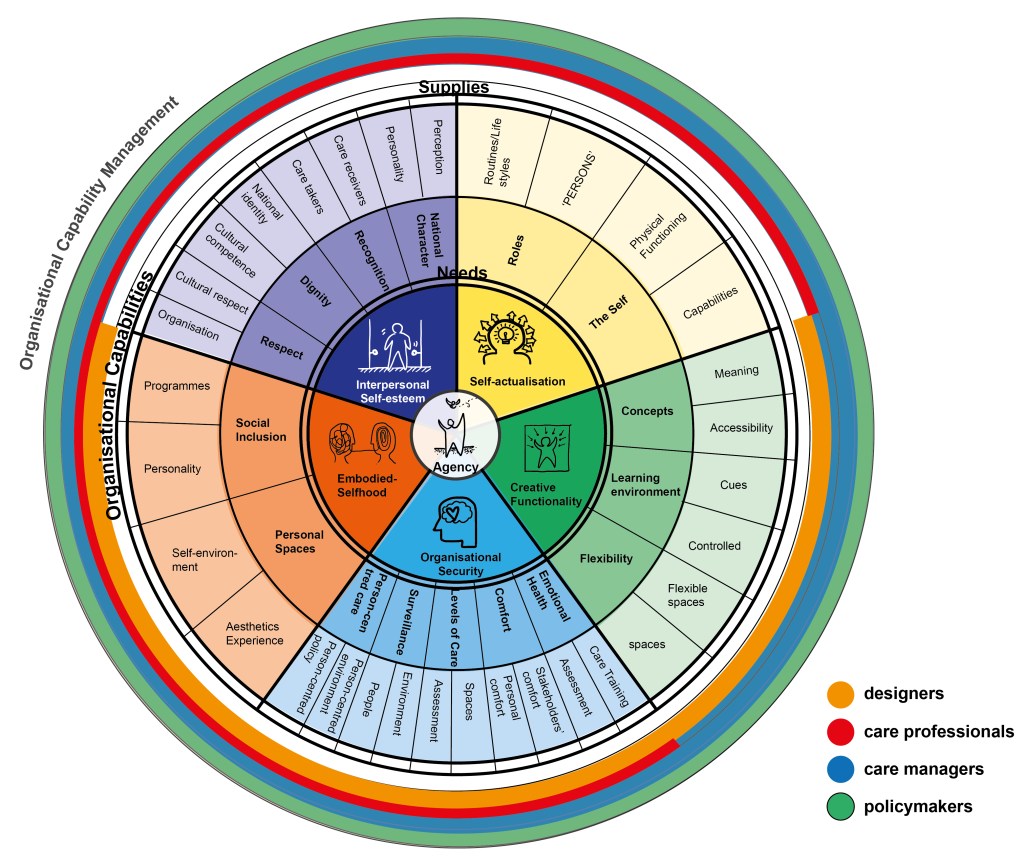 The main findings include five overarching domains – creative functionality (including three themes: concept, learning environment, flexibility), organisational security (including five themes: emotional health, levels of care, person-centred care, comfort, and surveillance), embodied selfhood (including two themes: personal spaces, and social inclusion), self-esteem (including four themes: dignity, recognition, respect, and national character) and self-actualisation (including two themes: roles and the self). – which indicate how the design of an enabling environment can support the quality of dementia care. The findings expand how the needs of people with dementia are related to the care professionals, and how the capability management from care managers or designers can support the needed environment. In addition, Ainsworth’s work on the quality of attachments has given rise to the suggestion that caregivers are the ‘architects’ of the quality of attachments, and that attachment, non-attachment or disordered attachment with the person cared for lies in the hands of caregivers. However, the context of Thailand has suggested the condition of an ambiguous society, where personal boundaries are shifting, disorienting, belonging to no place, or an unknown ‘home’. The sense of uncertainty and in-betweenness experienced by people are underlined. Therefore, this raises the question of the application of the culture of unbounded form and non-attachment. The design and assessment tools attempt to contribute to knowledge by conceptualising the important issues and aspects of an enabling environment for dementia care. The overriding objective of this research is to create new insights that provide original and effective ideas, which may have important social, cultural, economic, and political consequences. The research study attempts to contribute new knowledge to design and assessment tools for an enabling environment for dementia care by contextualising and testing the tools with potential user groups.
