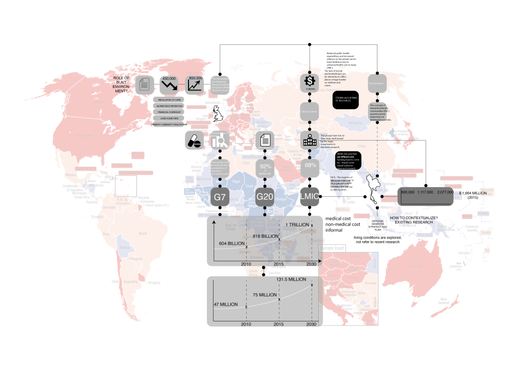 According to the World Health Organisation (WHO), dementia is an umbrella term for a neurogenerative disease with irreversible and progressive symptoms, which include memory loss, mood changes, disorientation and issues with communication and reasoning. Globally, the total number of people with dementia have been increased from 41 million in 2015 to 131.5 million in 2050, where much of the increase is in developing countries, against the backdrop of deteriorating quality of care and high turnover rates among formal care staff. Dementia-friendly environment is designed to support their symptoms within a physical environment, which lead to a ‘specialised’ environment. An enabling environment enables the psychosocial barriers of environments and attitudes imposed by care stakeholders. Caring is the experience and feeling of a strong positive effect in defining identity in certain places and the communities, such as home, workplace, and neighbourhood. In this case, transnational dementia care produces a new perception of place and identity by introducing the emotional design of distance/place attachment in ageing. Thus, designing is not a static process but requires opening the world for people with dementia.