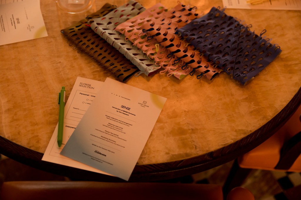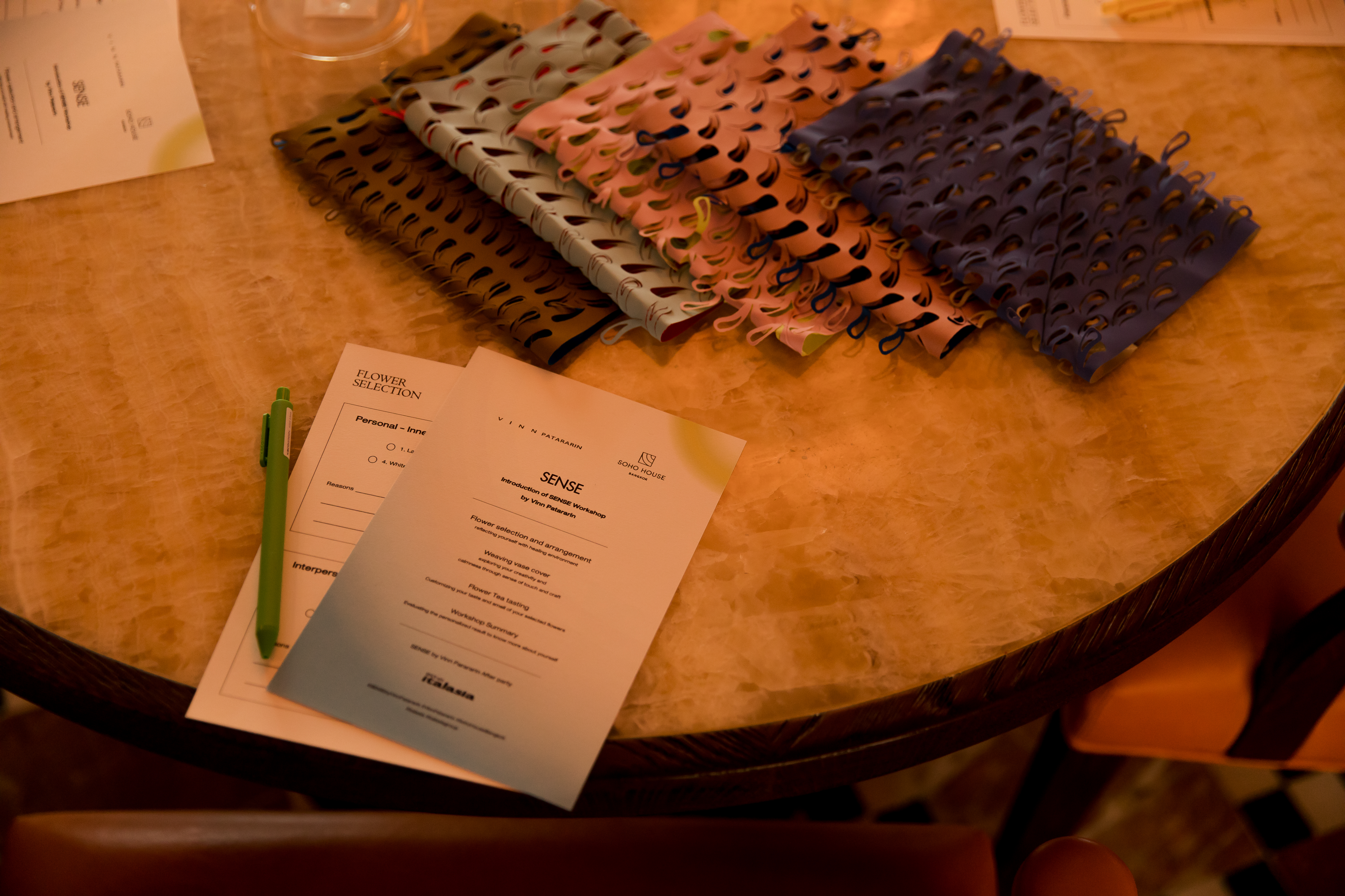 VINN PATARARIN is a multi-disciplinary fashion design studio based on cutting-edge experimentation on textiles and architecture with the core questions of material and space to express and unfold the users’ selves. Throughout modern society, the rush of time and chaotic lives delay the reflective practice, occasionally stepping back to ponder the meaning of transpiration in an immediate environment. With a lack of time and space, the emergence of pandemics, and anxiety about environmental destruction, humans seek the biophilic trend to respond to a sense of home by using nature as a core sanctuary. Essentially, nature becomes a driving source of separation behind many physical, psychological, and emotional alignments pervasive in modern-day society. By functioning as a multi-sensory environment, nature is a well-known method of creating a safe space and calming atmosphere to allow respite away from agitation and anxiety. The human self can be refined through the therapy of the human senses, in which multiple senses can be integrated and stimulated by natural mediums, such as flowers, to resonate through the concept of floriography. Thus, the SENSE workshop offers the space and time for participants to activate their human senses, including visual, sound, odour, touch, taste, and movement, through activities of flower arrangement, textile vase weaving, and flower tea tasting to unfold their hidden messages of the current emotional expression within the therapeutic group setting.